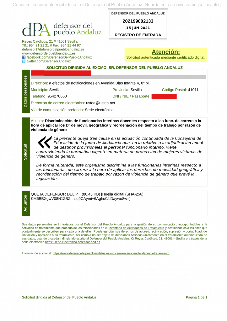 USTEA y su Espacio Feminista exigen ante el Defensor del Pueblo Andaluz el fin de la discriminación a las docentes interinas víctimas de violencia de género.