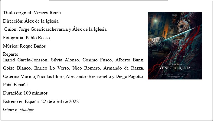 Nos encontramos ante el último filme del conocido esperpéntico y grotesco director Álex de la Iglesia, el cual ha dejado en los últimos años los derroteros locales y transita por territorios extranjeros. En esta ocasión, Venecia no solo va a ser el paisaje donde se desenvuelve la trama sino que va a ser una de las grandes protagonistas en esta obra que parte del género del slasherde los años sesenta pero que se mezcla de lleno con el terror italiano, lo cual ya podemos ver en sus extraordinarios títulos de crédito homenaje al giallo de los años setenta y al teatro parisino de humor naturalístico Gran Guignol plagado de un horror ciertamente amoral, gran referente de los filmes slasher en la actualidad.