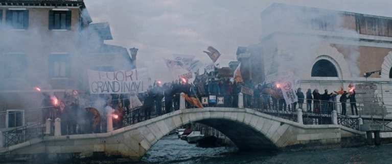 En esta ocasión, nos encontramos a un grupo de ruidosos turistas españoles que llegan a Venecia en pleno carnaval para divertirse y celebrar que la protagonista -Ingrid García-Jonsson- se va a casar dentro de poco. Así, mediante un montaje acelerado -y casi atropellado para algunos espectadores- se nos presenta a unos personajes que, tras unos precipitados diálogos, van a encontrarse en el centro de la acción, una Venecia desbordada por el turismo masificado donde unos misteriosos asesinatos a turistas a manos de un enmascarado disfrazado de bufón van a ser el telón de fondo de la historia. Y es que, tal y como podemos ver en el tráiler, en los primeros quince minutos de película ya hemos acudido al asesinato -eso sí, siempre bajo el gore-, al misterio -para lo cual el carnaval veneciano y el uso de las máscaras van a ser la clave- y a la velocidad de la trama, la cual va a ir reduciéndose poco a poco para dejar paso al suspense y va a retomarse en ciertos momentos específicos de la trama. De esta manera, el espectador se introduce en el caos imperante a través de los callejones oscuros de una ciudad laberíntica y en el interior de edificios casi en ruinas sin por ello dejar de lado los famosos canales en algunas secuencias, no solo mostrarnos la parte más conocida de la ciudad sino para mostrarnos la realidad de una Venecia donde el mar está recuperando su espacio natural robado por el ser humano.