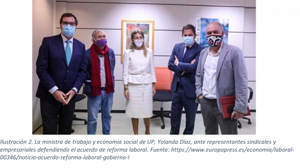 Por poner un ejemplo, la reforma laboral del partido popular en su última legislatura se tradujo en una victoria de la patronal y el gobierno conservador sobre los sindicatos y la población trabajadora; por otra parte, la última negociación de la ministra de trabajo Yolanda Díaz de Unidas Podemos dentro del gobierno de coalición PSOE-UP, consiguió lo que parecía imposible, que los intereses de cada una de las partes quedasen cubiertos y que tanto trabajadores como empresarios llegasen a un acuerdo significativamente bueno para ambos, ningún empresario debería querer tener trabajadores a disgusto, y siempre está en la profesionalidad y buen ánimo del trabajador hacer su trabajo de la mejor manera posible.